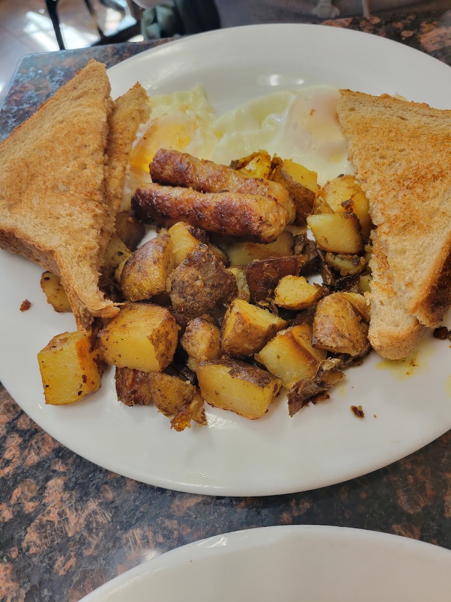 This small place is an absolute delight. Five tables and seven stools, it isn't big but delivers a big meal. The morning we were there we had to wait about 10 minutes before the four stools at the counter opened up and this was indeed a breakfast and a show. The griddle and main area for the staff is right there and we were able to watch a groddle-master at work. A constantly turning-overmpile of flattop cooked potatoes, along with a steady stream of eggs and other hot items being cooked up and wafting the delicious smells into the air. Our meals were big, but able to finish them, thought the amount of potatoes on the plate was quite a bit. Two eggs over hard, wheat toast, potatoes and a mug of black coffee is the all-American breakfast and it was done up right. Coffee was never cold and never more than half-full, the waitress was really on top of things and a steady stream of locals either picking up breakfast or coming in for the tables. The wife said her OJ was really good and everyone joyed their meals Heads-up that this place is cash only.